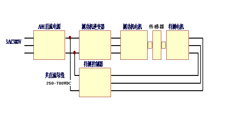 3、 用交流變頻回饋加載,加載能量通過(guò)交流負(fù)載電機(jī)回饋AFE直流電源,因?yàn)闄C(jī)械損耗的緣故,不夠的電由電網(wǎng)供給。驅(qū)動(dòng)與加載電機(jī)同時(shí)工作時(shí),保證加載電機(jī)所吸收的電能反饋給驅(qū)動(dòng)電機(jī),并保證電能的轉(zhuǎn)換效率不小于70%。